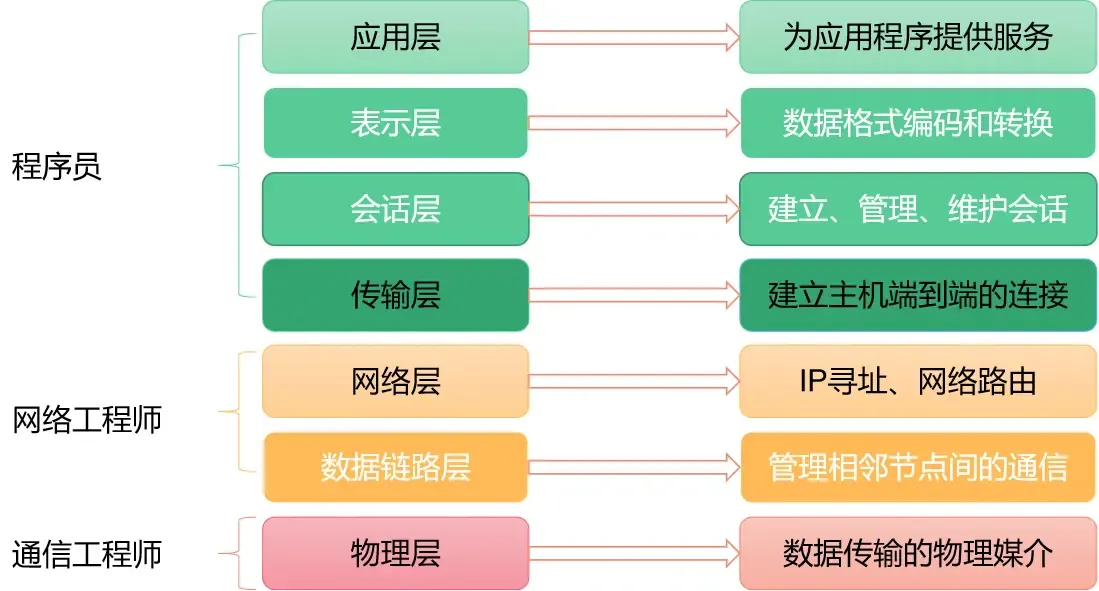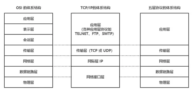 这四层网络结构,但并没有给出网络接口层的具体内容,因此在学习和开发中,通常将网络接口层替换为 OSI 七层模型中的数据链路层和物理层来进行理解。