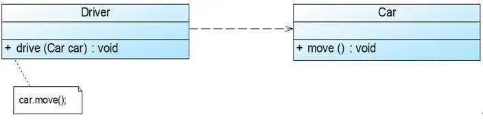从上图我们可以看到,Driver的drive方法只有传入了一个Car对象才能发挥作用,因此我们说Driver类依赖于Car类。在UML类图中,依赖关系用一条带有箭头的虚线表示。