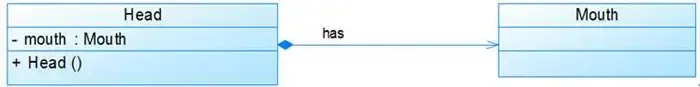 显然,嘴是头的一部分且不能脱离了头而单独存在。在UML类图中,组合关系用一个带实心菱形和箭头的直线表示。