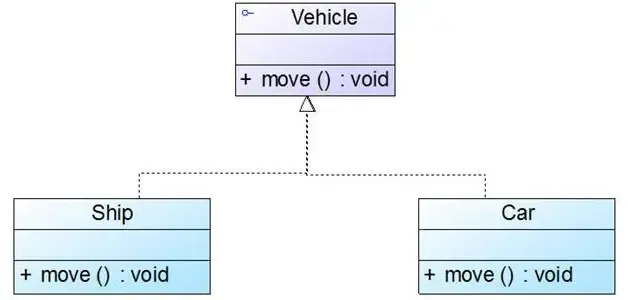 接口之间也可以有与类之间关系类似的继承关系和依赖关系,但是接口和类之间还存在一种实现(Realization)关系。这种关系对应implement关键字,在UML类图中用带空心三角形的虚线表示。如下图中,Car类与Ship类都实现了Vehicle接口。实现类指向接口
