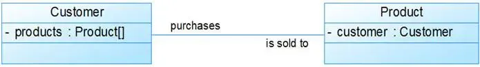 从上图中我们很容易看出,所谓的双向关联就是双方各自持有对方类型的成员变量。在UML类图中,双向关联用一个不带箭头的直线表示。上图中在Customer类中维护一个Product[]数组,表示一个顾客购买了那些产品;在Product类中维护一个Customer类型的成员变量表示这个产品被哪个顾客所购买。