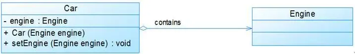 上图中的Car类与Engine类就是聚合关系(Car类中包含一个Engine类型的成员变量)。由上图我们可以看到,UML中聚合关系用带空心菱形和箭头的直线表示。聚合关系强调是“整体”包含“部分”,但是“部分”可以脱离“整体”而单独存在。比如上图中汽车包含了发动机,而发动机脱离了汽车也能单独存在。