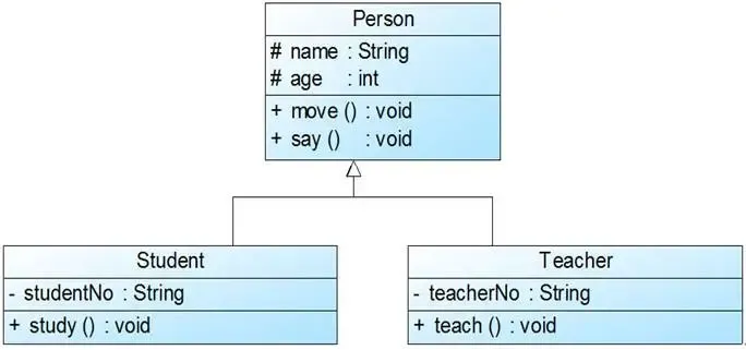 泛化(Generalization)关系也就是继承关系,用于描述父类与子类之间的关系,父类又称作基类或超类,子类又称作派生类。继承关系对应的是extend关键字,在UML类图中用带空心三角形的直线表示,如下图所示中,Student类与Teacher类继承了Person类。由子类指向父类。
