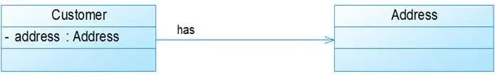 我们可以看到,在UML类图中单向关联用一个带箭头的直线表示。上图表示每个顾客都有一个地址,这通过让Customer类持有一个类型为Address的成员变量类实现。