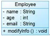 在UML类图中,类使用包含类名、属性(field) 和方法(method) 且带有分割线的矩形来表示,比如下图表示一个Employee类,它包含name、age和email这3个属性,以及modifyInfo()方法。