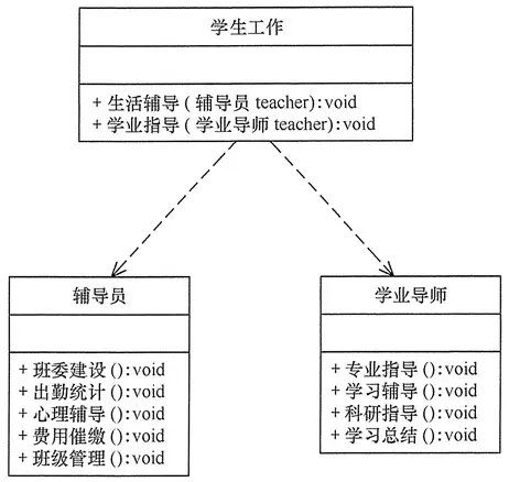 分析:大学学生工作主要包括学生生活辅导和学生学业指导两个方面的工作,其中生活辅导主要包括班委建设、出勤统计、心理辅导、费用催缴、班级管理等工作,学业指导主要包括专业引导、学习辅导、科研指导、学习总结等工作。如果将这些工作交给一位老师负责显然不合理,正确的做 法是生活辅导由辅导员负责,学业指导由学业导师负责,其类图如图所示。