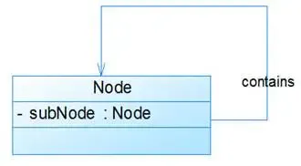 自关联在UML类图中用一个带有箭头且指向自身的直线表示。上图的意思就是Node类包含类型为Node的成员变量,也就是“自己包含自己”。拥有者指向被拥有者