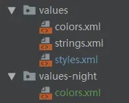 原有的color.xml文件内的颜色系统默认作为白天模式下的颜色取值。对于夜间模式,我们需要新增values-night文件夹,里面包含一个新建的color文件