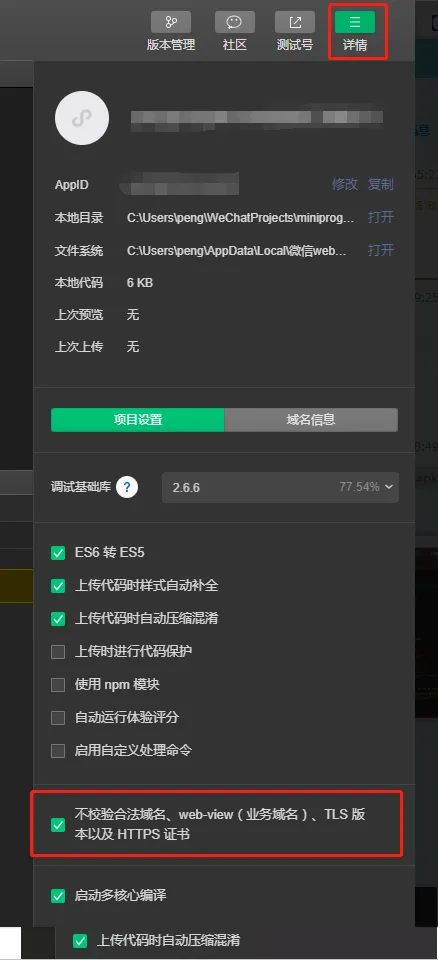 微信小程序需要https请求,(没有https证书的可以再调试时设置支持http)