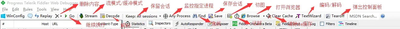 说明注释、重新请求、删除会话、继续执行、流模式/缓冲模式、解码、保留会话、监控指定进程、寻找、保存会话、切图、计时、打开浏览器、清除IE缓存、编码/解码工具、弹出控制监控面板、MSDN、帮助。