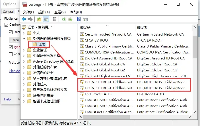 在手机上需要安装Fiddler根证书,因为Fiddler是通过自己生成的证书对网络请求重新签名进行https会话解密的,如果不安装证书的话只能抓取HTTP请求。