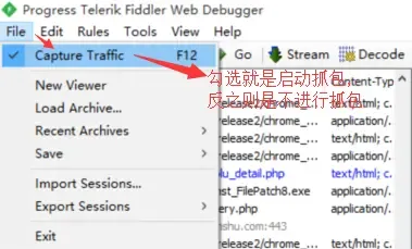 要使用Fiddler进行抓包,首先需要确保Capture Traffic是开启的(安装后是默认开启的),勾选File->Capture Traffic3。
