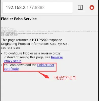 打开手机浏览器,输入Fiddler Server地址, 跳转到 Fiddler Echo Service 证书下载页,点击FiddlerRoot certificate下载并安装;