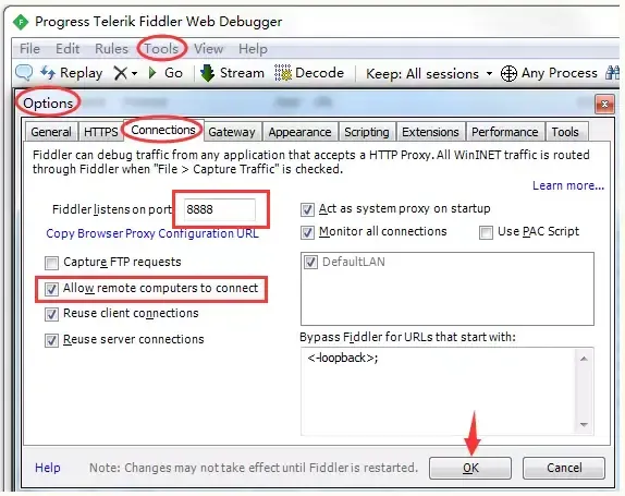 如果想要捕获手机上的通信数据,就需要手机连接上Fiddler代理,而Fiddler默认是不允许其他设备进行连接的,解决办法:点击 Fiddler->Tools -> Options,在 Connections 面板选中 Allow remote computers to connect 允许其他设备连接(此操作需重启Fiddler生效)。