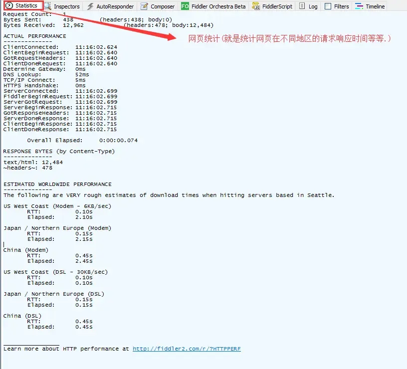 这一部分是统计信息视图,显示了所有HTTP通信,展示了哪些文件生成了当前请求的页面。可以选择一个或多个会话,然后得出所选会话的统计信息:
