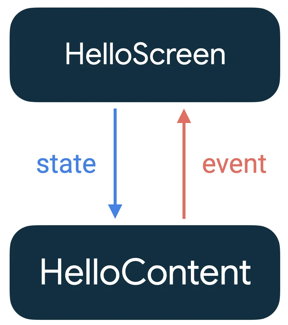 以上的逻辑也叫做:状态下降,事件上升。上例中,状态量从HelloScreen流向HelloContent,而事件则反向传递。 遵循这种编程模式,你可以将展示UI的可组合函数与存储状态变量解耦开来。