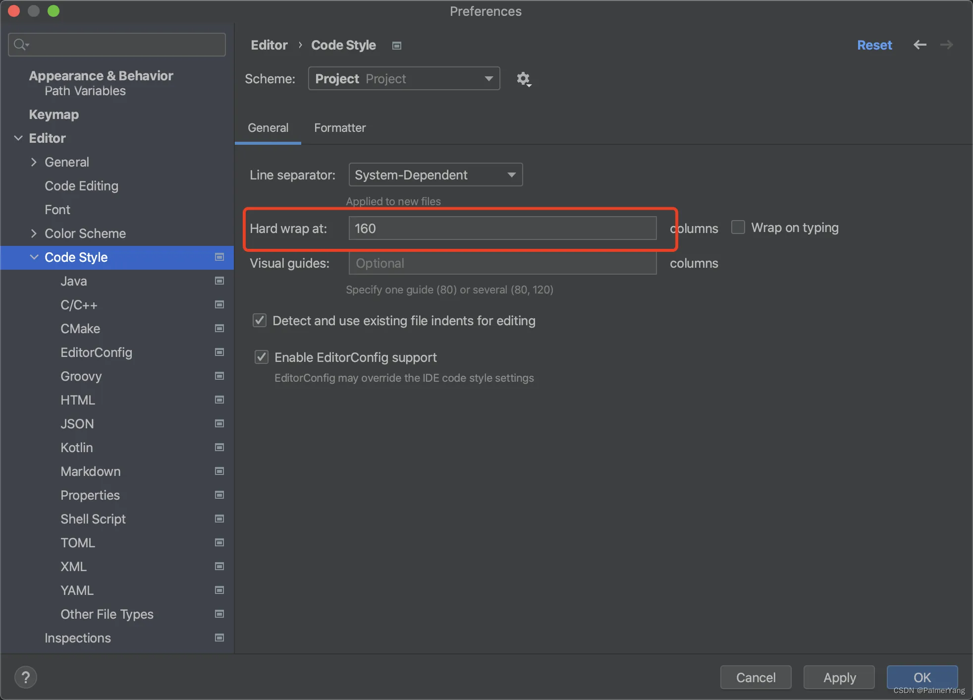 - 每行字数每行字符数不得超过 160 字符,设置 Editor -> Code Style.