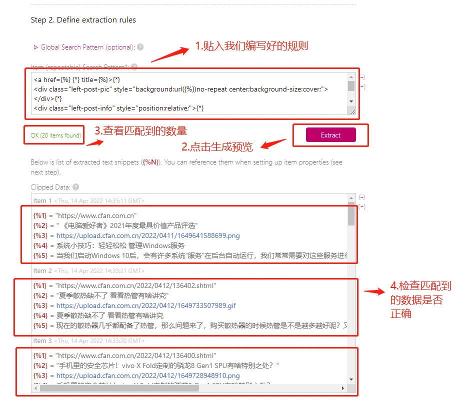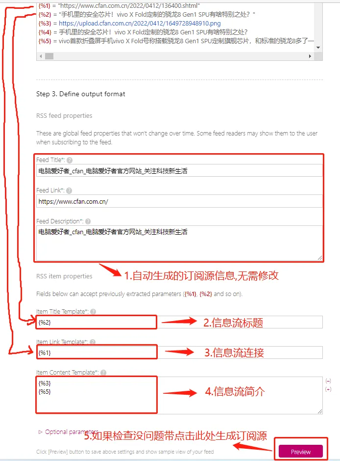 这一步需要将定义提取规则获取到的动态内容和我们Rss信息流匹配起来,Item Title Template(标题)、Item Link Template(链接)、Item Content Template(全文内容),将第二步获取到的内容输入,{ \ % 数字}的形式